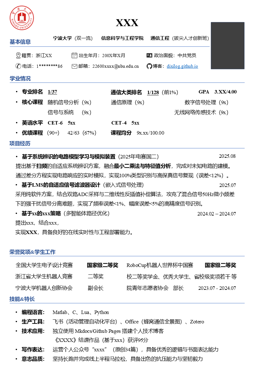 把名字放在最突出的位置,下面可以跟着你的学校信息,左右放着本科学校 logo 和你的帅照